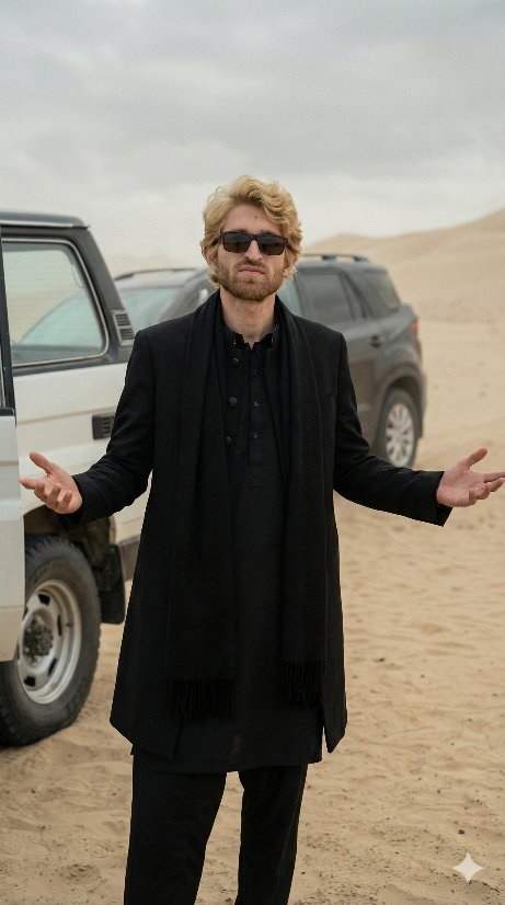 Ultra realistic cinematic photograph of a stylish young man standing in a desert environment, wearing an all black outfit: black traditional long coat over a black kurta, black scarf draped around the neck, black trousers. He has medium length wavy dark hair, light stubble, sharp facial features, and is wearing dark rectangular sunglasses. His arms are extended outward with palms slightly open, confident and calm posture. Background shows sandy desert dunes under an overcast sky, with two off road SUVs partially visible behind him, white and dark colored vehicles parked at an angle. Natural soft daylight, muted tones, dusty atmosphere, shallow depth of field. Shot on DSLR, 85mm lens, t 2.8, high resolution, ultra detailed textures, realistic skin tones, cinematic color grading, professional fashion photography, centered composition, eye level angle, photorealistic. First image is the reference for angle and position and second image is my face and the final image should be in 9:16 ratio.